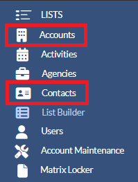 1. To view the Account or Contact Profile Page, select Contacts or Accounts from the left-hand navigation panel.