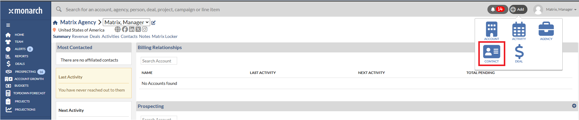 To add an Agency Contact, begin by clicking the +Add button, then selecting Contact, as shown below.