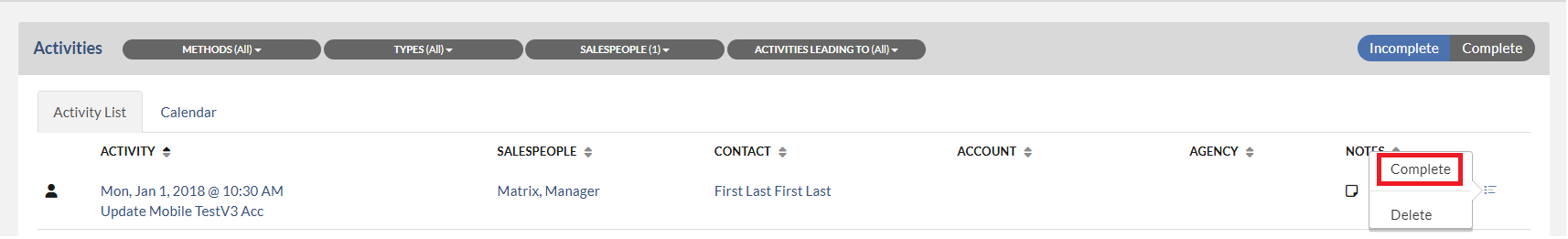NOTE: The best practice is to Complete the Activity on the day or at the time, that it is done. Completing your Activities as you have done them, not only keeps you from falling behind and having to ask this question but it keeps your calendar clean and your Matrix Activity Report accurate.