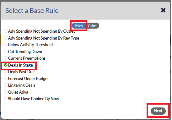3. Select Deals in Stage and click Next. Note that you will not see the Next button until an alert is selected.