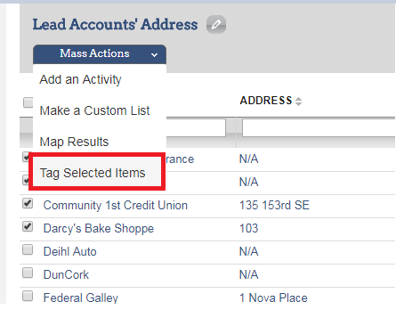 3.Check the box or boxes next to the account or contact you would like to add an activity to. Then click the Mass Actions button and select Tag Selected Items.