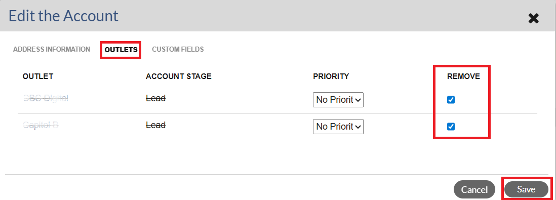 4. Check the Remove box(es) for the Outlet(s) that you wish to delete. If you remove all the outlets on the Account, the Account will be automatically deleted.
