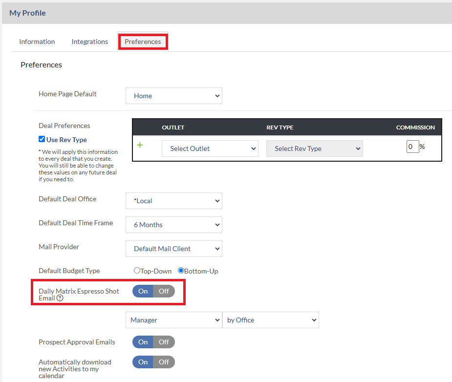 The Espresso Shot is a daily email providing you with targeted information from Matrix, which will help you start your morning off right! As a manager, you can choose whether you want to show Salesperson, Outlet, or Office data in your Espresso Shot.