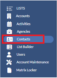 Within Monarch, one can delete old contacts that are no longer needed. Please note when deleting a contact, this will also remove the contact from any Activities or Accounts the Contact is associated with. Once the contact is deleted, it cannot be restored. To delete a contact, please navigate to Contact list by clicking Contacts from the left-hand navigation panel.