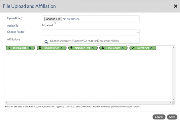 - Fields include Upload File (mandatory), Assign To (auto-populated with the salesperson’s name), Choose a Folder, and Affiliations.