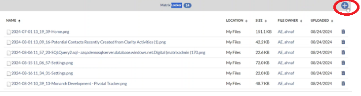 - Columns Display: The Matrix Locker section displays multiple columns—Name, Location, Size, File Owner, and Upload Date providing comprehensive details about each uploaded file.