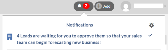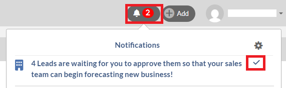 When the notification is enabled and at least one of Leads has been submitted to you, then you will see the notice next to the Bell icon located on the upper right corner of your screen. Once you click the Bell icon, you will see the message of "x Leads are waiting for you to approve them so that your sales team can begin forecasting new business!"