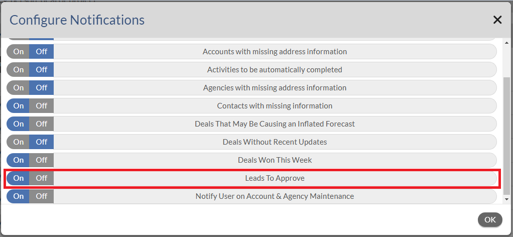 3. Click Off in front of the Leads To Approve.