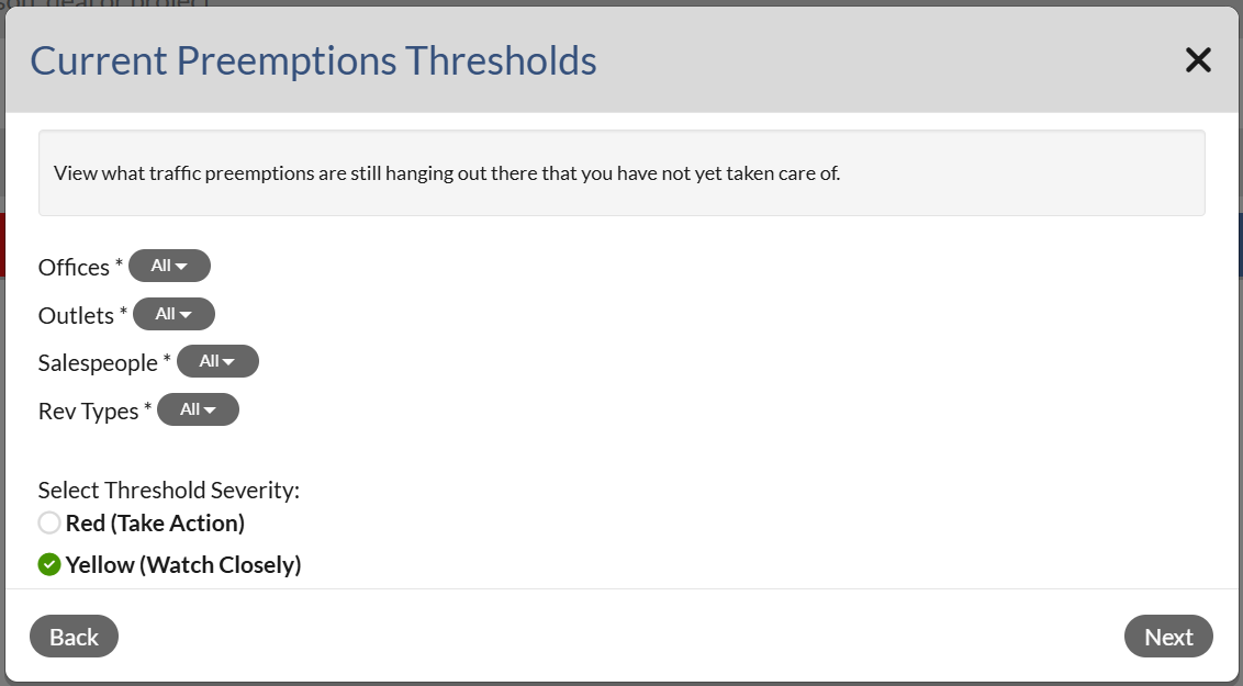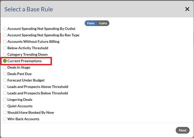 3. Select Current Preemptions and click Next. Note that you will not see the Next button until an alert is selected.